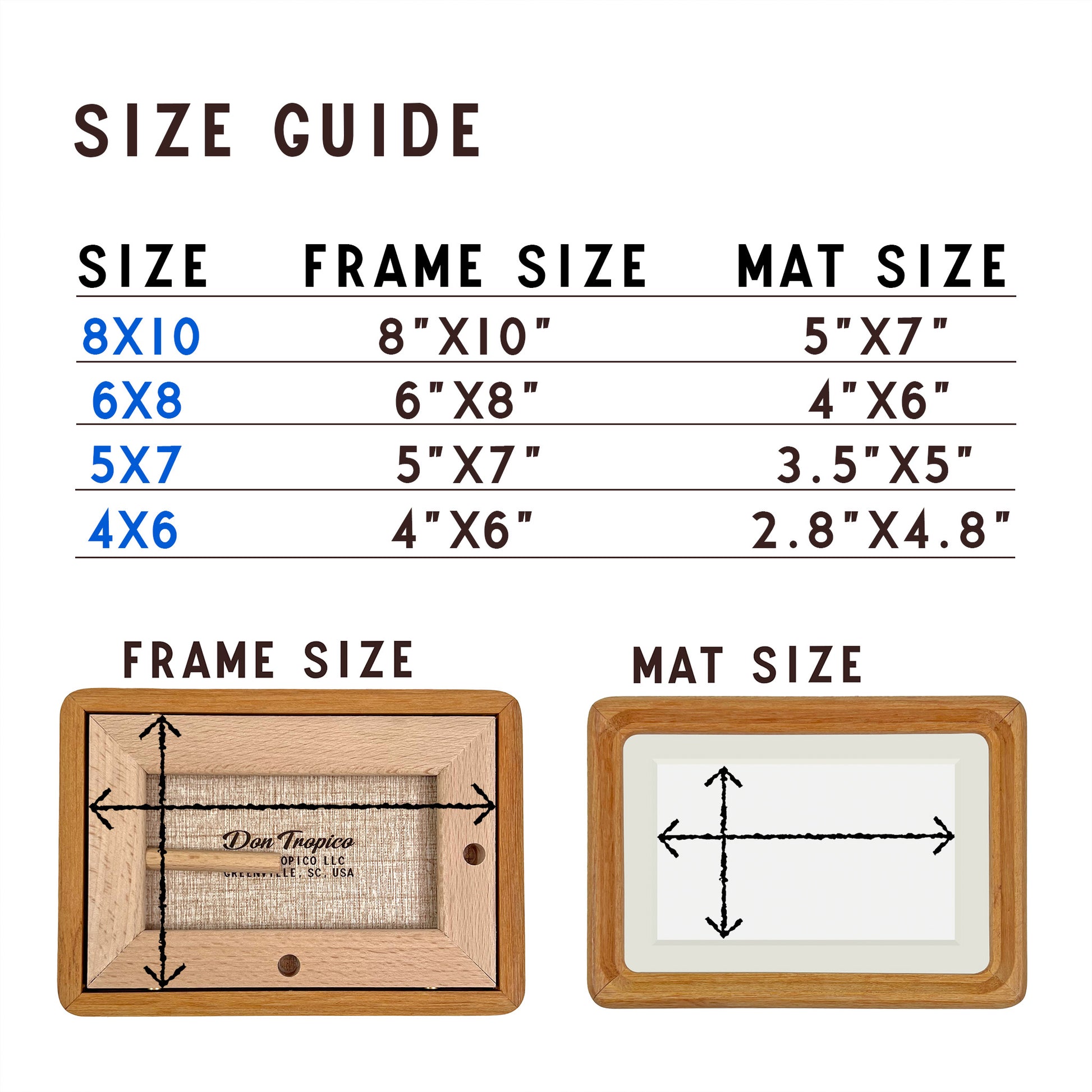 - 8x10 accepts 8"x10" photo and has a mat window of 4.8" x 6.8" (5"x7")